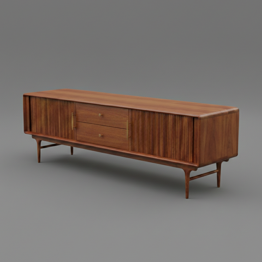 A beautiful balance of form and function, the Elanore TV Cabinet is crafted from rich solid wood with a timeless retro finish. Featuring fully closing tambour doors, inset drawer pulls, and a warm, mid-century profile, it brings refined storage and versatility to any living space.