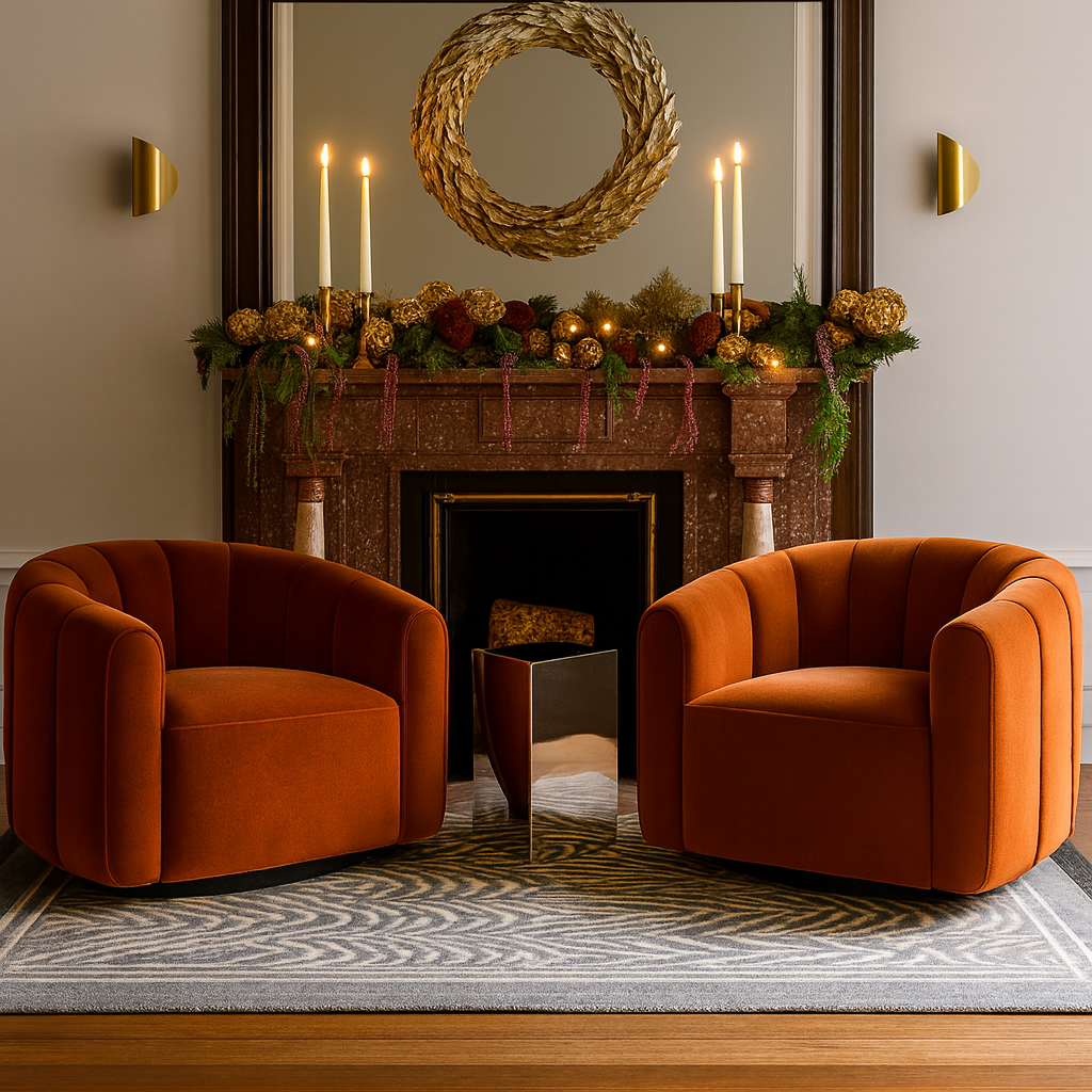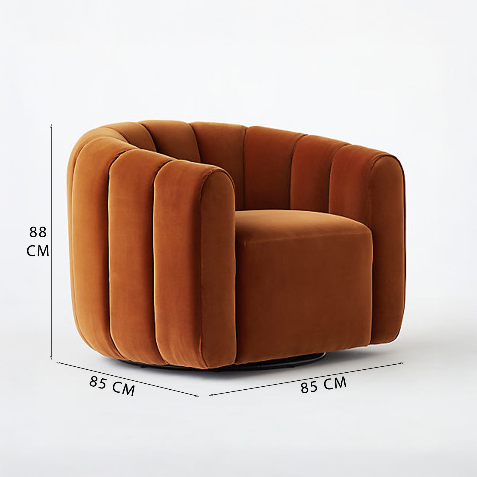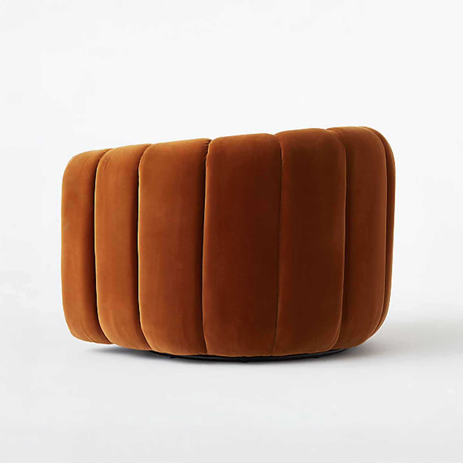 A plush, cocooning barrel chair with a smooth 360° swivel. Gabriele’s rounded silhouette and vertical channeling bring a soft, sculptural presence to living rooms, bedrooms, or a reading nook. The Burnt Orange velvet adds warmth and depth while the compact footprint keeps it apartment-friendly.