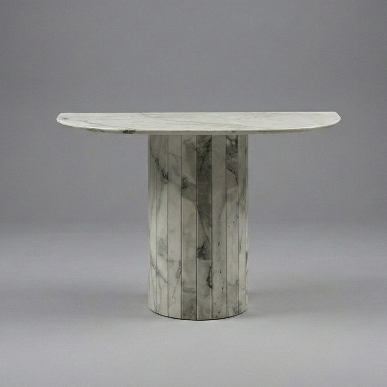 Bring sculptural elegance to your space with the Lunara Console. Crafted from exquisite Italian Arabescato Corchia marble, this piece celebrates natural veining and soft curvature in perfect harmony. Its fluted pedestal base and semi-circular design make it an ideal statement for entryways, living rooms, or refined interior settings.