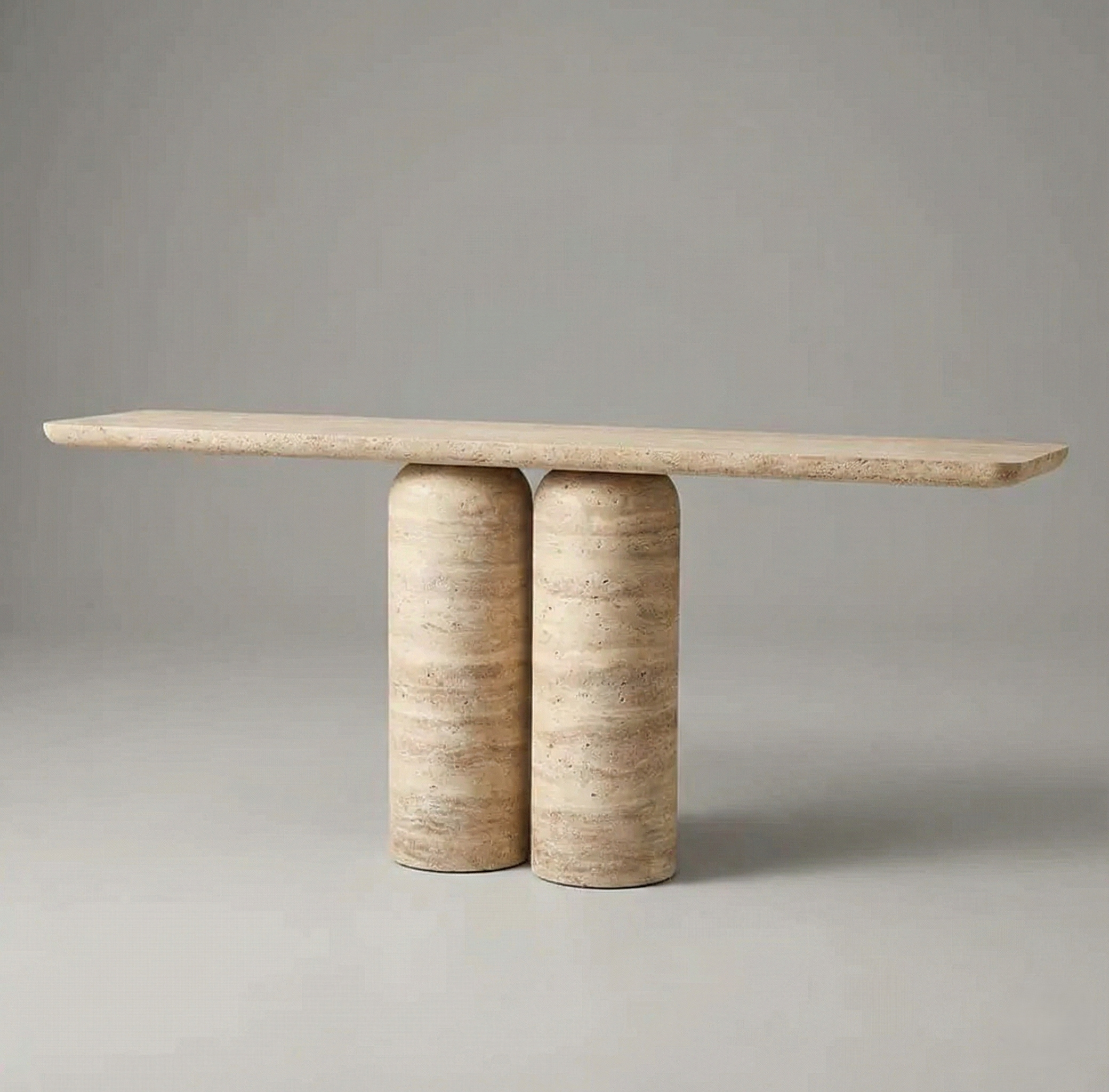 Discover the timeless allure of the Ravello Italian Travertine Console Table. Its sculptural double-pedestal base and sleek travertine surface exude modern luxury, while the streamlined silhouette offers both a striking focal point and practical surface, effortlessly enhancing contemporary living spaces.